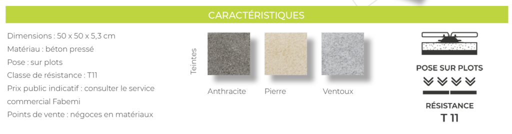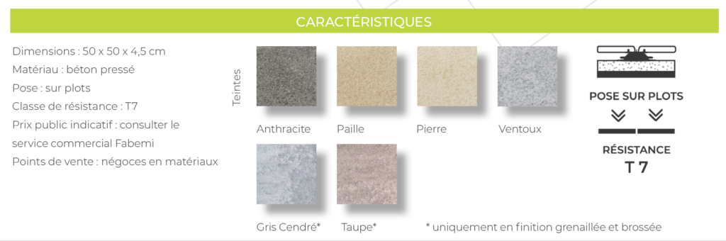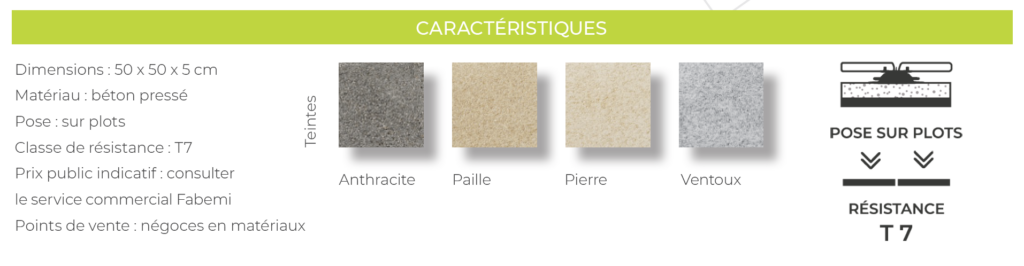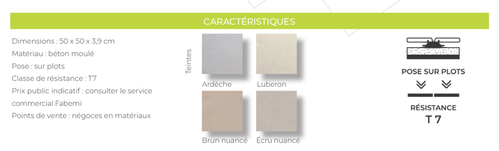 Conçues pour répondre aux besoins spécifiques des étancheurs, les dalles en béton à poser sur plots Fabemi se distinguent par leur simplicité de mise en œuvre et leur capacité à garantir une protection durable des surfaces, tout en restant démontables. Proposées dans une large palette de coloris, ces dalles sont disponibles en classe de résistance T7 (usage privé) ou T11 (réalisations publiques ou collectives), ce qui les rend compatibles avec tout type de projet, en neuf comme en rénovation.