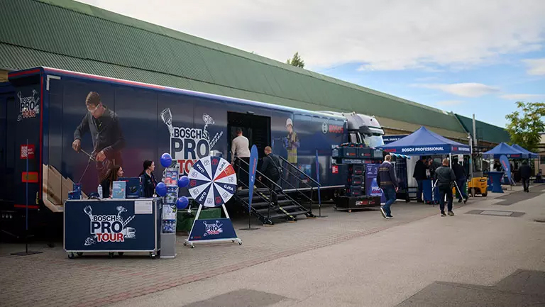 Le camion Bosch Pro Tour se transforme en un véritable showroom au sein duquel les utilisateurs professionnels pourront échanger avec les experts Bosch sur les produits et services Bosch Professional. Étendu sur plus de 200 m2, le dispositif Bosch Pro Tour (camion, stands et ateliers) offre un bel espace pour découvrir et tester en direct les produits phares et les dernières nouveautés de la marque.