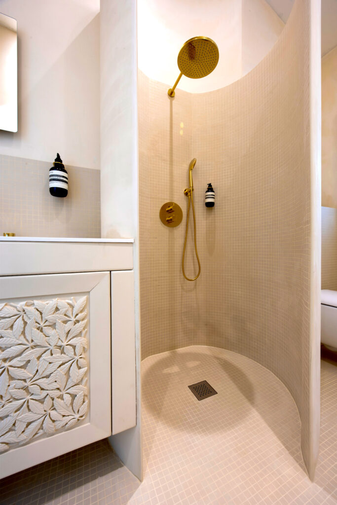 La forme circulaire adoucit la circulation : on entre, on pivote, on se déplace naturellement. Le plan vasque en solid surface a été découpé sur mesure pour suivre la courbe, tandis que le WC suspendu s’insère discrètement dans le creux derrière la paroi arrondie. Côté finitions, les murs et sols sont revêtus de mosaïques et de béton ciré dans des teintes lin-sable, un enduit à la chaux a également été appliqué et est visible depuis le bureau. La robinetterie et le miroir présentent quant à eux des reflets dorés.