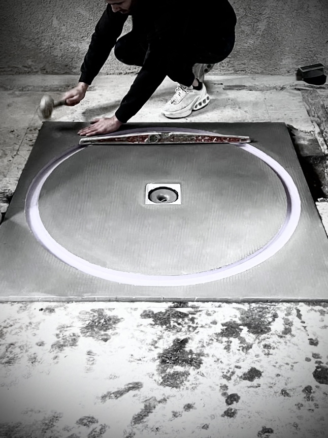 Après avoir hésité entre Aqua-Circle et Aqua-Spiral, Aqua-Circle a été retenu pour sa géométrie simple et son intégration cohérente au plan. La douche vient légèrement empiéter sur la pièce voisine, ce qui permet de préserver la largeur de circulation devant la cabine et de conserver un accès confortable au WC, sans cloisonner. La cabine a été installée de plain-pied, sans ressaut, offrant un accès direct et confortable ainsi qu’une continuité de sol appréciable dans ce petit volume.